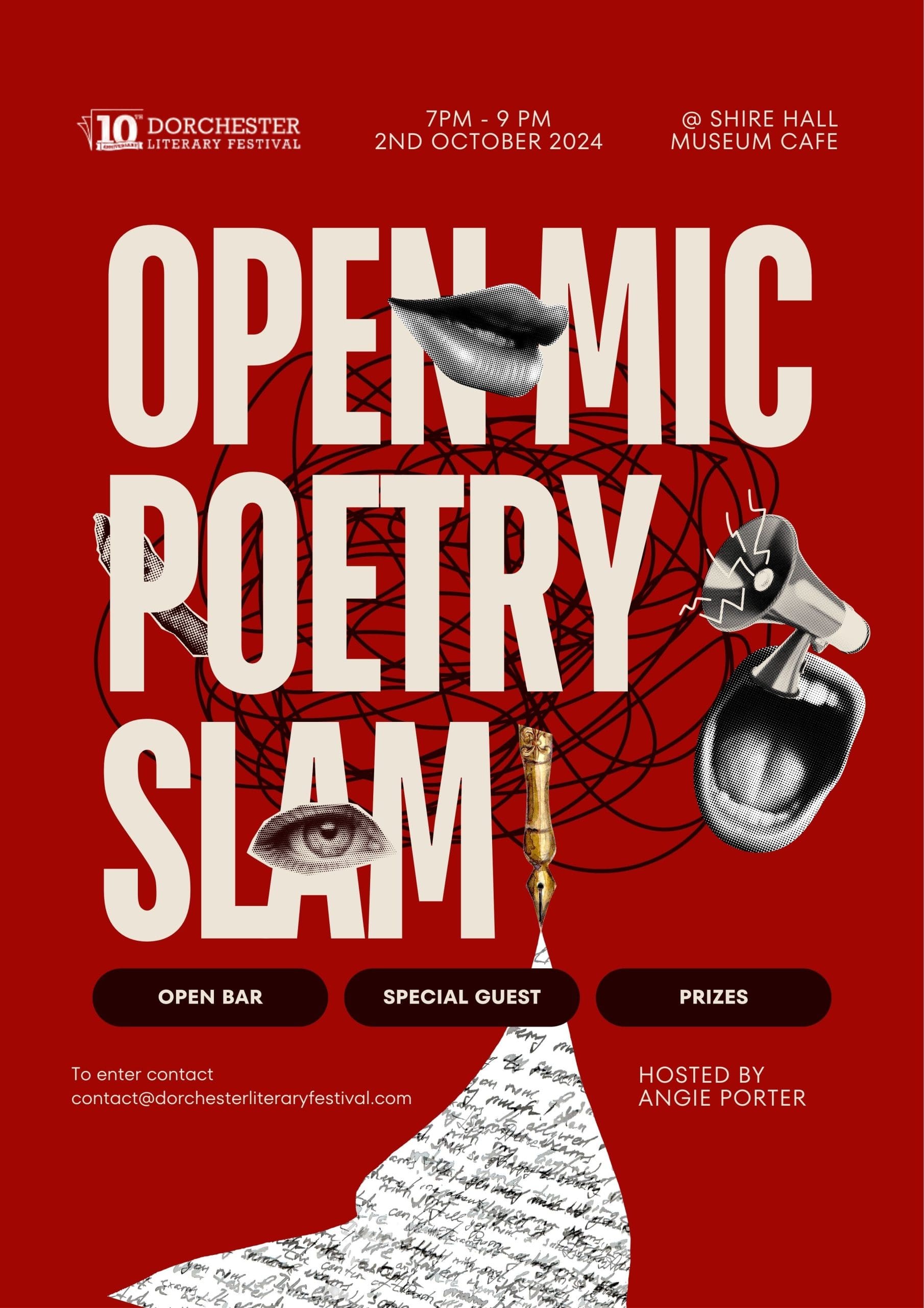 Shire Hall Museum Cafe High West Street, DorchesterAn open mic event for local writers and poets. Join us to hear poets read and perform their work. To sign up to participate at this event please contact us directly via contact@dorchesterliteraryfestival.com or just come along and listen. Angie Porter is a local poet, performer and painter who brings creativity to the fore in ... Poetry Slam with Angie Porter